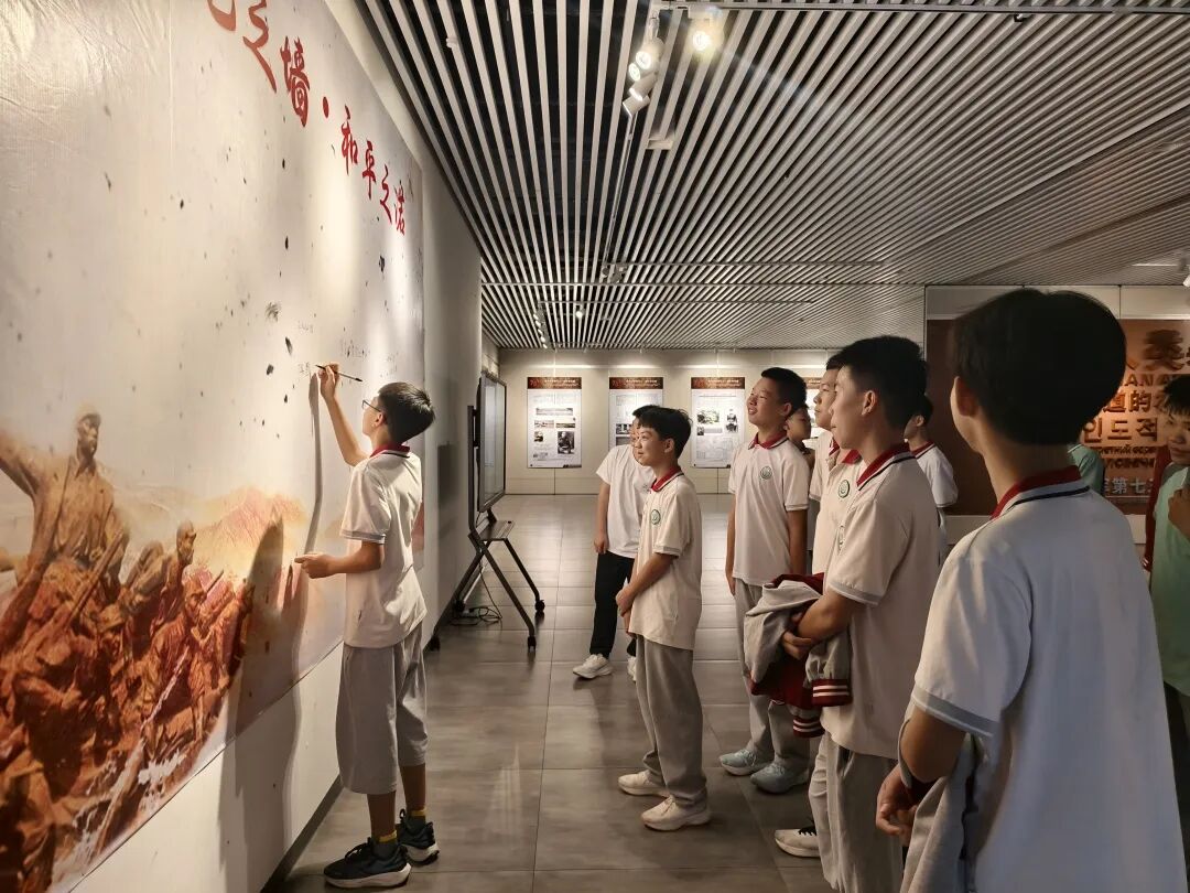 參觀結束后,同學們紛紛在和平之墻前駐足簽名。指尖撫過墻面凹凸的紋理,仿佛觸碰到歷史與未來的交匯點。黑色的簽字筆在白色墻面上流轉,一個個名字、一句句誓言,漸漸連成一片熾熱的 “心愿矩陣”。